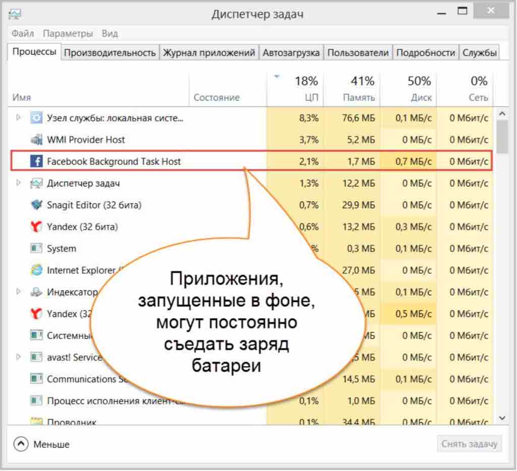 Откройте Диспетчер задач, нажав Ctrl+Shift+Esc, и проанализируйте использование процессора фоновыми программами. Отсортируйте приложения в списке по использованию процессора и понаблюдайте некоторое время. Удаление ненужных программ, работающих в фоне, увеличит время работы от аккумулятора.