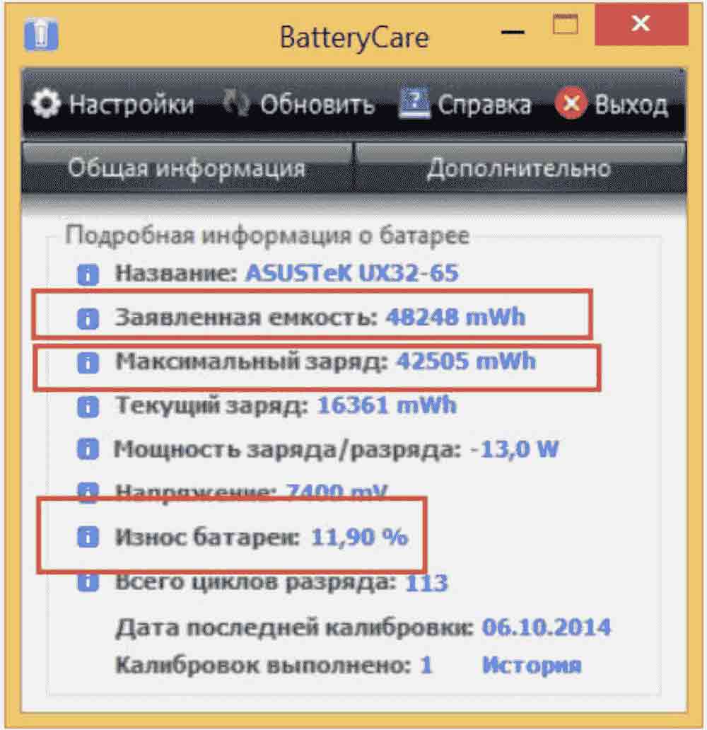После запуска в главном окне всех утилит нужно найти заводскую и текущую ёмкости АКБ и сравнить их. Также важен уровень износа. Если он более 50%, аккумулятор, скорее всего, придётся заменить. Но не спешите — попробуйте сначала другие советы.