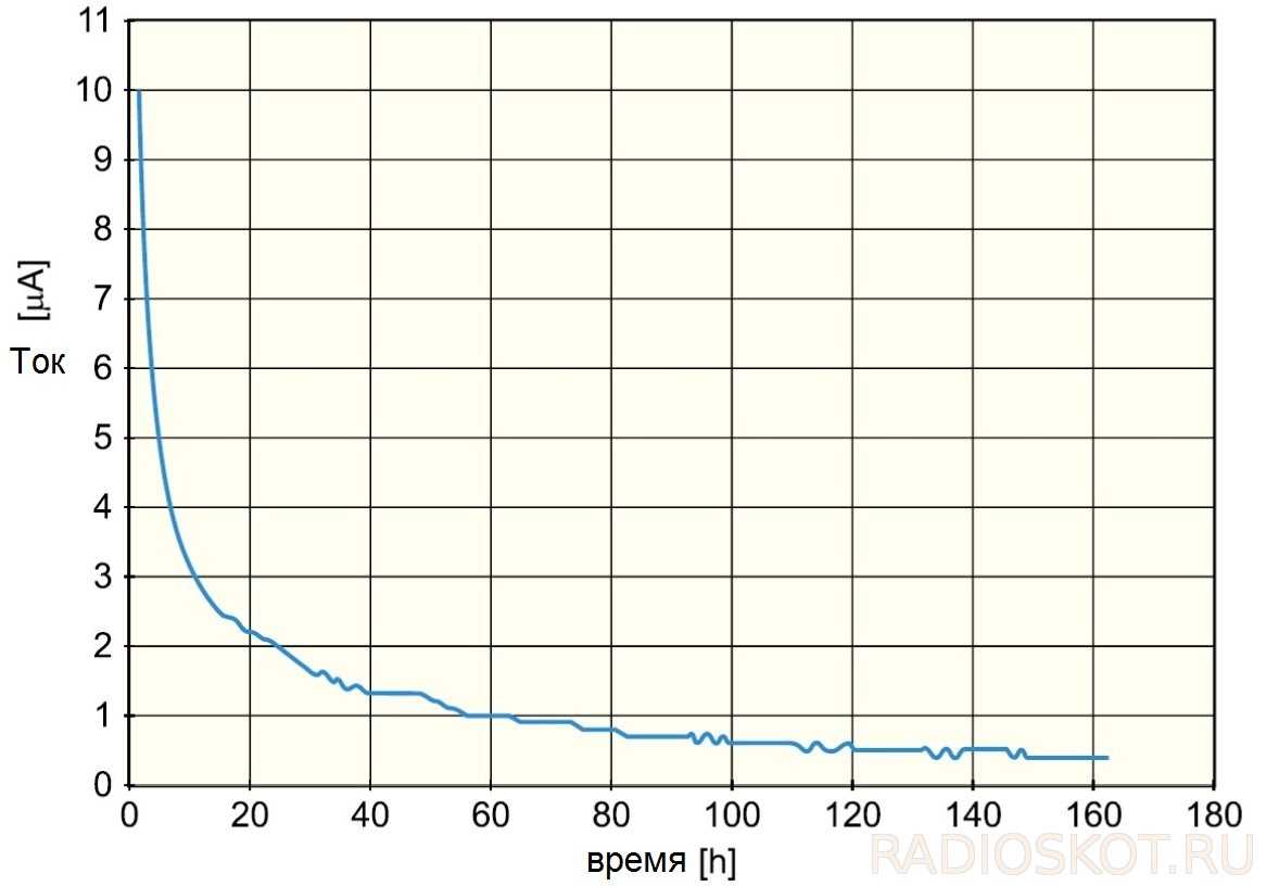 Зависимость тока утечки суперконденсатора GA 109 при 2,5 В от времени.