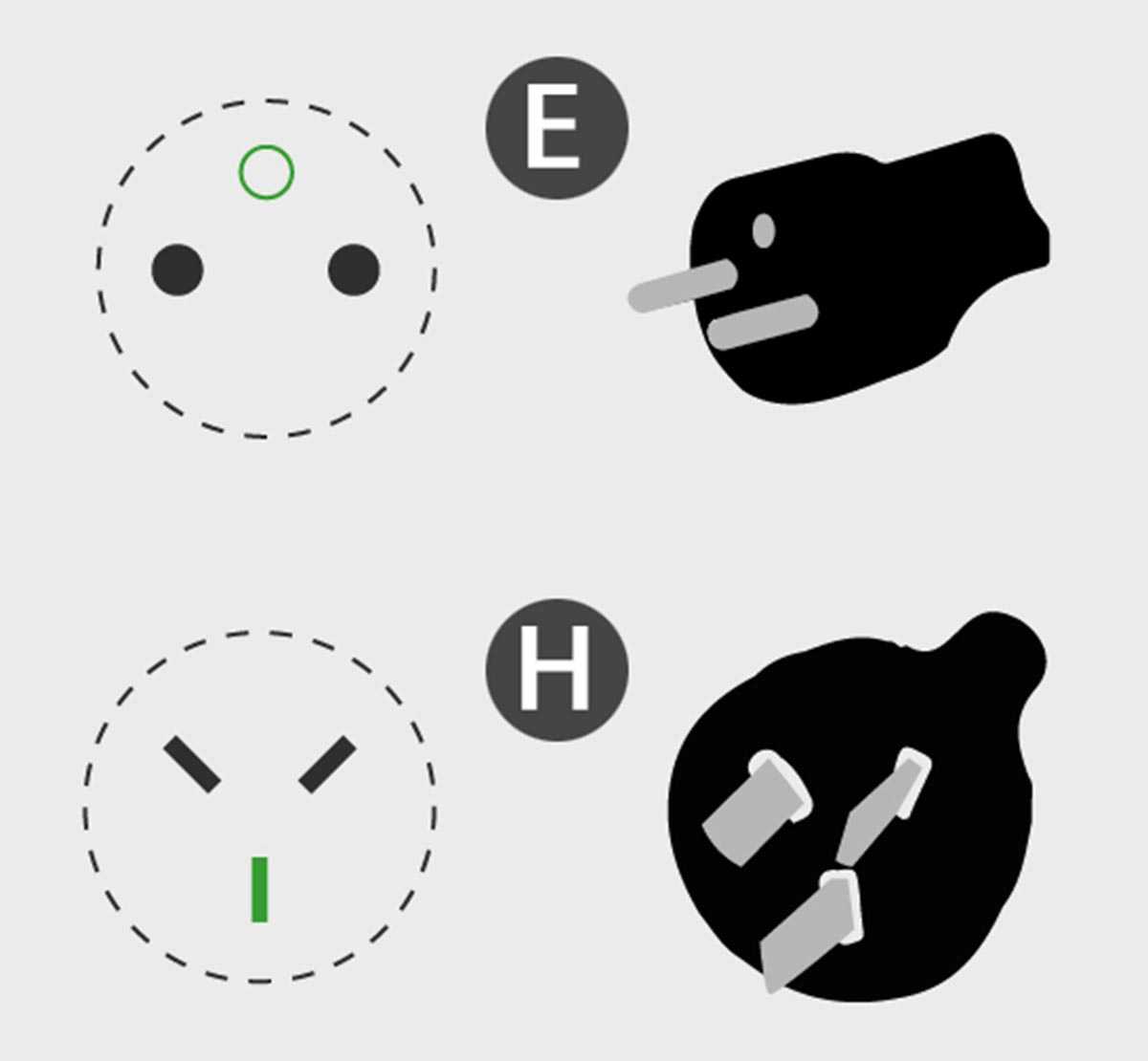 Тип H уникальный стандарт подключения электроники для Израиля. Он не применялся в других странах и не может быть совместим с другими комбинированными типами вилок/розеток. Старый стандарт предусматривал три плоских контакта в форме буквы Y, а обновленный – три круглых штырька на равном удалении друг от друга.