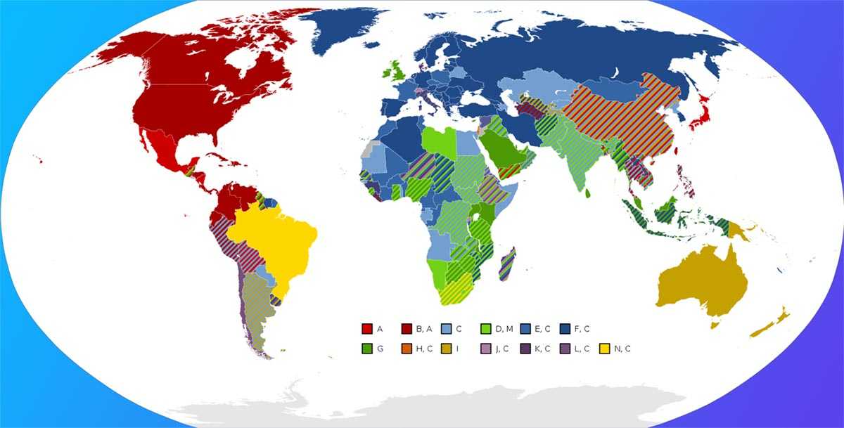 Распространенность разных типов вилок и розеток по странам