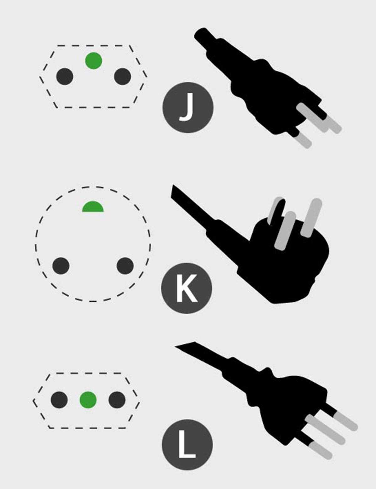 Тип J – это швейцарская вилка и розетка. Похожа она на вилку типа C, но имеет дополнительный контакт заземления посередине и два круглых контакта питания. Используется в Швейцарии и за ее пределами в Лихтенштейне, Эфиопии, Руанде и на Мальдивах.