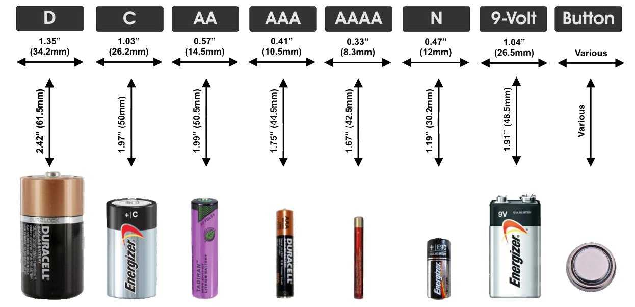 Батарейки с форм-фактором C питают устройства, требующие малого или среднего тока. Бывают солевые, щелочные и никель-металлогидридные батарейки, с разными параметрами емкости и напряжения.