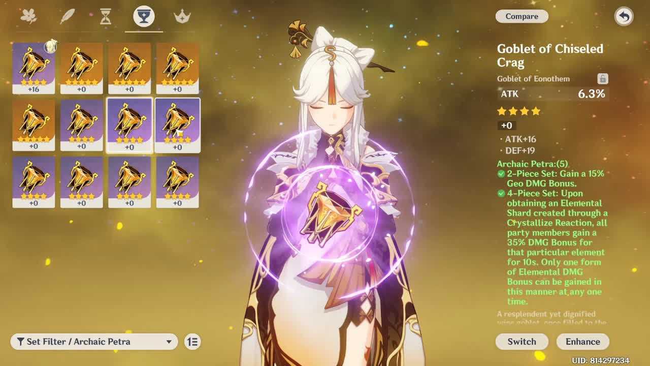 Архаичный камень — два предмета из набора повышают бонус Гео урона на 15%. С четырьмя предметами владелец сета сможет увеличивать бонус элементального урона всем союзникам на 35% в течение 10 секунд — произойдет это после сбора осколков, образованных во время реакции Кристалл. Правда, одновременно бонус действует только на один случайный элемент.