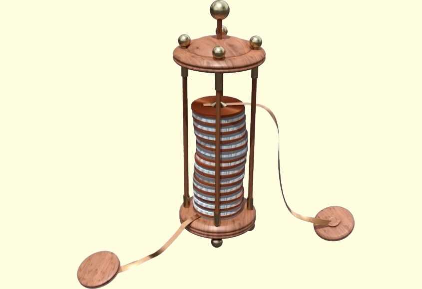 Александро Вольта создал первый источник тока («Вольтов столб»), который можно было использовать на практике. Этот источник состоял из медных и цинковых пластин, между которыми были проложены кружочки ткани, пропитанные раствором щелочи.