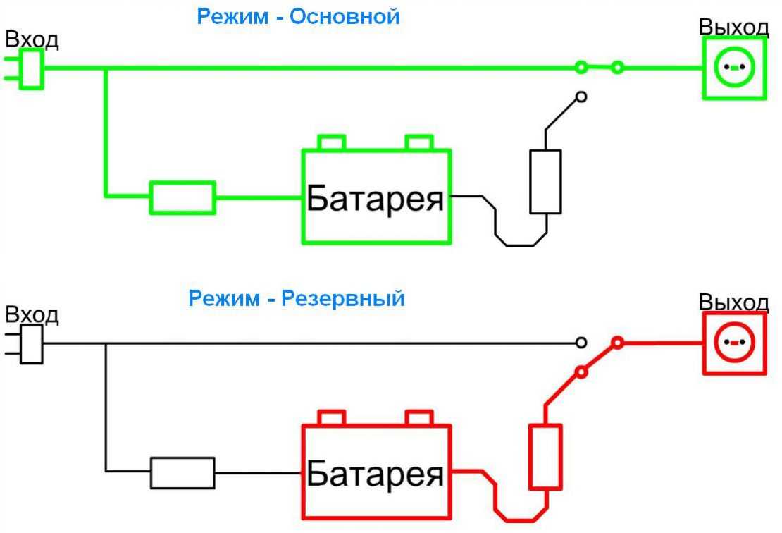 Если плата контроля определяет, что напряжение сети соответствует норме с учётом допустимых отклонений, то потребитель получает электропитание напрямую от сети. Как только девиация напряжения выйдет за пределы допуска, электроника переключает нагрузку на питание от аккумулятора.