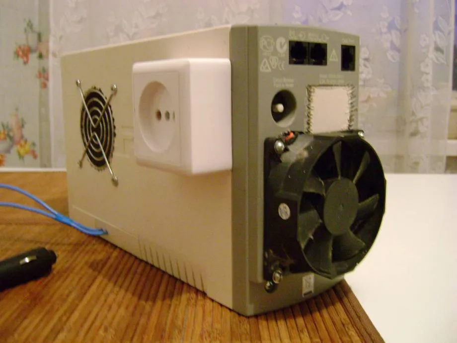 Напряжение, снимаемое с батареи, поступает на простой инвертор, где преобразуется в 220 В. Предварительно напряжение сети проходит через индуктивно-ёмкостный фильтр, который позволяет блокировать большую часть импульсных высокочастотных помех и одиночные короткие выбросы напряжения.