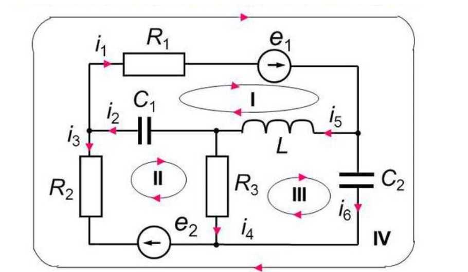 - контуры (обозначены римскими цифрами I, II и III) показывают замкнутые пути прохождения токов по нескольким ветвям.