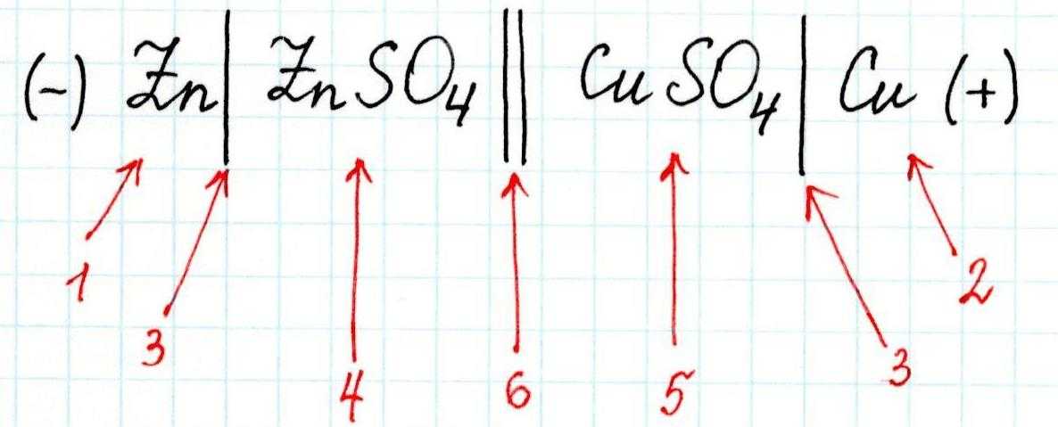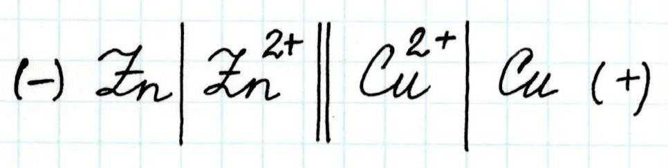 По соглашению металл, который окисляется и образует анод (-), всегда располагается слева, а его ион в водном состоянии отделяется полосой (|). Анодная полуячейка отделена от катодной двумя перемычками (||), которые представляют солевой мостик. Справа находится металлическая полуячейка, уменьшенная и образующая катод (+).