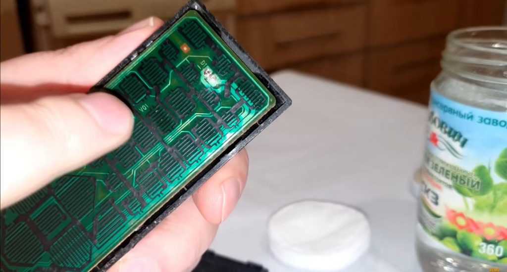 Удалять загрязнения с этой детали нужно спиртом или специальной жидкостью для чистки электронных устройств. Такое средство просто распыляют на плату. Если используется спирт, им смачивают ватный диск или тканевую салфетку и аккуратно, без нажима, протирают устройство. Протерев плату с двух сторон, ее выкладывают на бумажное полотенце и оставляют высыхать.