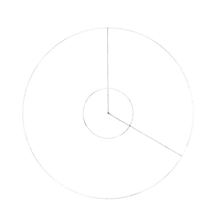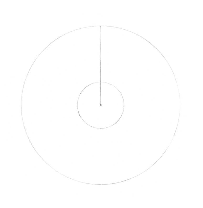 От центра и до внешней окружности проводим вертикальную линию вверх. Чтобы линия получилась идеально ровной, воспользуйтесь линейкой.