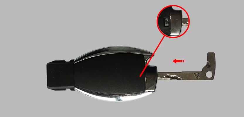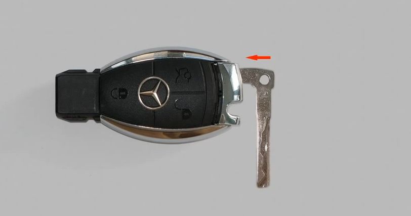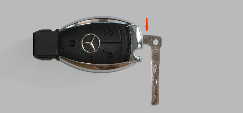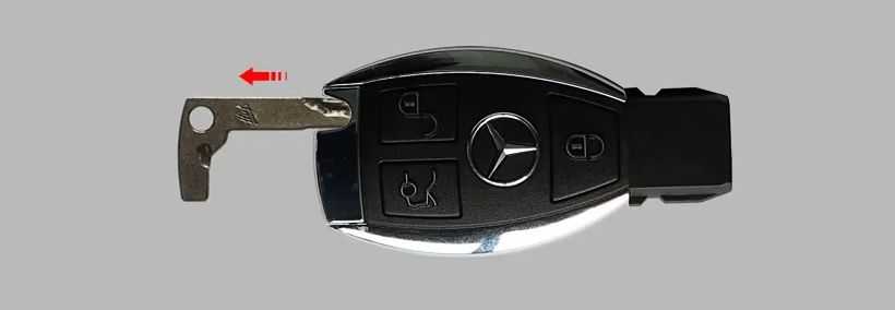 Для того, чтобы открыть ключ Мерседес рыбка, можно вооружиться инструментом в виде пинцета, острого ножичка, какой-нибудь пилочки для ногтей, либо воспользоваться штатным ключом, которым предусмотрено надавливание на защёлки внутри ключа. У маленькой рыбки защёлка серого цвета, её можно нажать жалом. У большой рыбки защёлка представляет из себя тоненький паз, примерно размером с торец железного жала, вставляемого в ключ. Этим жалом также нажимается защёлка в том месте, где находится верхняя часть металлического жала с кольцом, когда ключ собран, то есть, в задней части ключа. Нужно нажать на защёлку, поддеть острым предметом отсек с батарейками и оттянуть его назад.