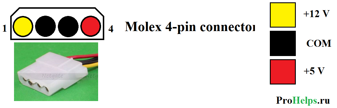 Четырех контактный периферийный силовой кабель. Он был использован для флоппи-дисков и жестких дисков и до сих пор очень широко используется. Вам не придется беспокоиться об установке это разъема, его нельзя установить неправильна. Люди часто используют термин «4-контактный Molex кабель питания» или «4-контактный Molex» для обозначения.