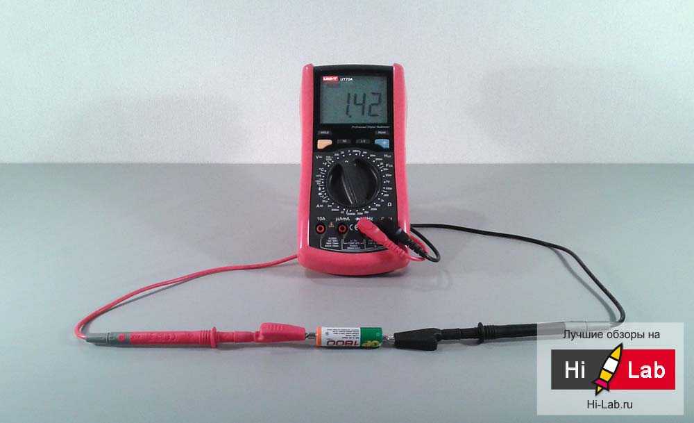 - Щупы подносим к контактам батарейки. Здесь всё, как учили в школе: плюс к минусу, минус к плюсу.
