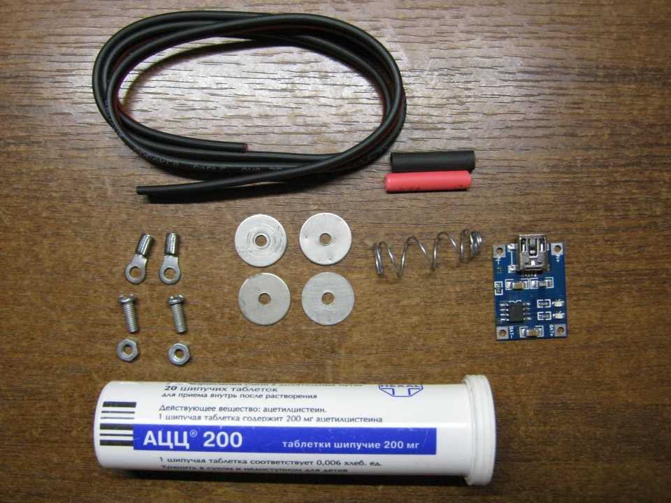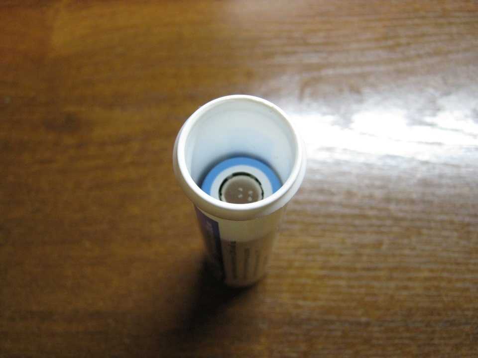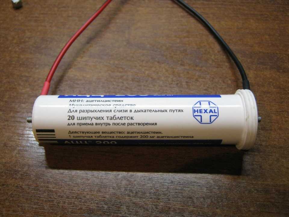 Аккумуляторы перемерил, выбрал три штуки полу-живых, напряжение на них было чуть больше 1В, три штуки почти живых, напряжение на них чуть больше 0,8В. Остальные 6 штук разряжены в ноль… Решил зарядить те, которые хоть что-то выдавали и проверить, что они из себя представляют. Раньше я с ними не сталкивался, зарядного нет для них, но когда-то купил у китайцев платку для зарядки подобных аккумуляторов. Поскольку это всё было на грани проверки, начал думать, как подцепиться к аккумулятору… Не спрашивайте, почему не купил специальную контейнер — просто потому, что у нас в городе их нет и отродясь не было)))На глаза попалась баночка от таблеток