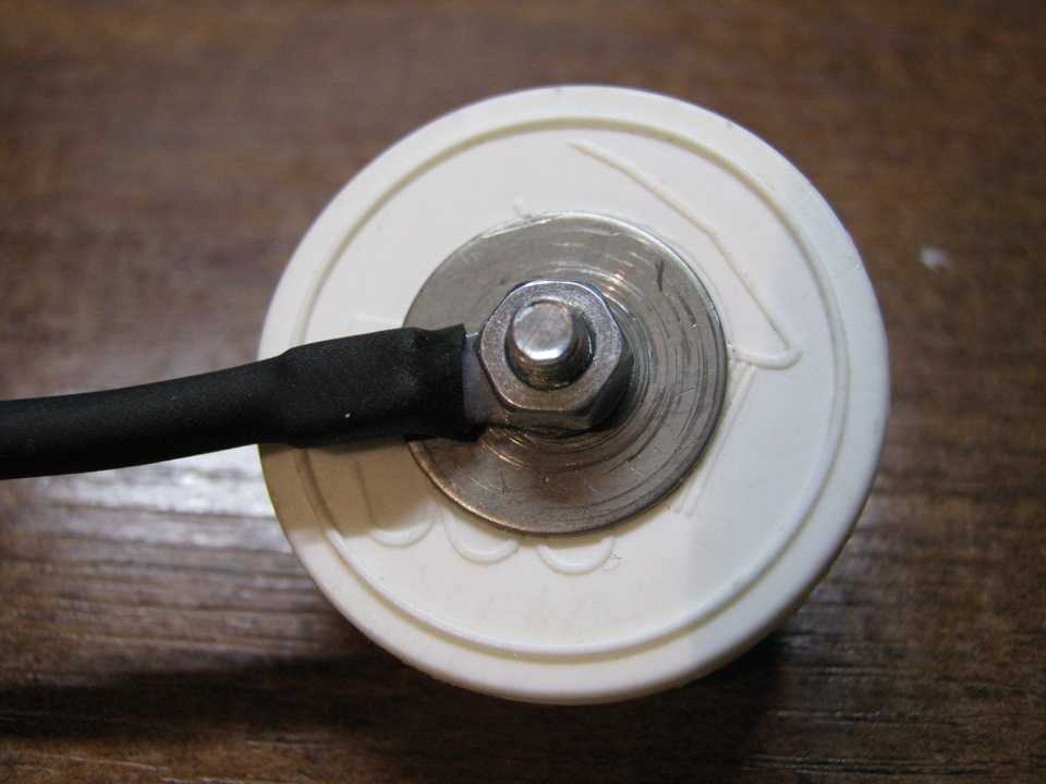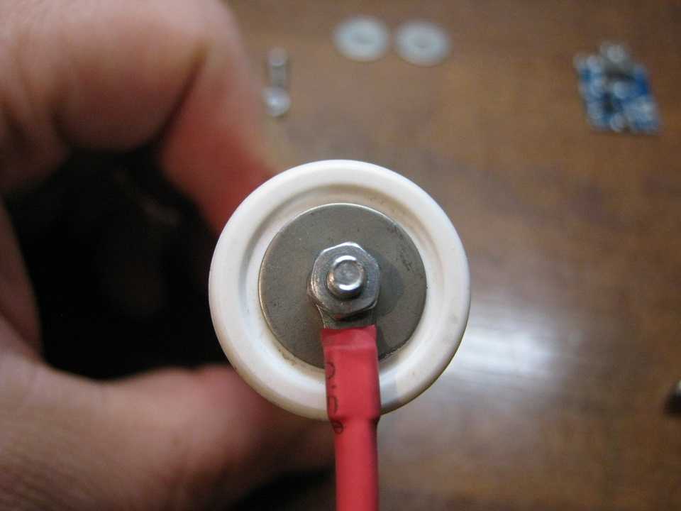 Закинул в баночку шайбу, вставил болтик, снаружи накинул ешё одну шайбу, потом клемму плюсового провода и накрутил гайку