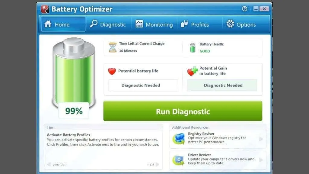 Battery Optimizer использует запатентованные методы анализа для проверки существующего состояния аккумулятора вашего ноутбука и предлагает меры, которые вы можете предпринять для его сохранения.