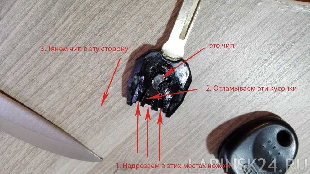Чип достать без опыта кажется по началу сложно, но опытным путем был найден простой способ, который показан на фото. Ничего не ковыряем, просто надрезаем ножом в месте борозд, пластик там мягкий и едет как по маслу. далее просто чуть раздвигаем эти части и видим, что чип болтается, просто вынимаем его вытягивая через сторону где были наши надрезанные борозды не ковыряя ничего ножом.