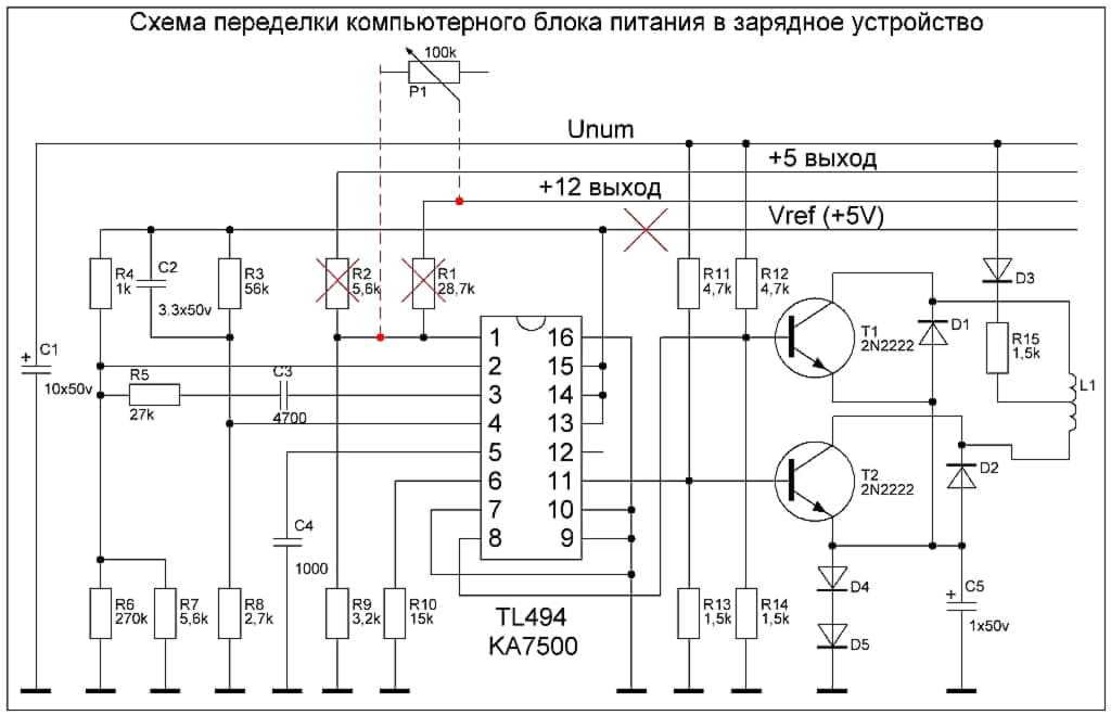 В демонтированный из компьютера БП вносят согласно схеме некоторые изменения: