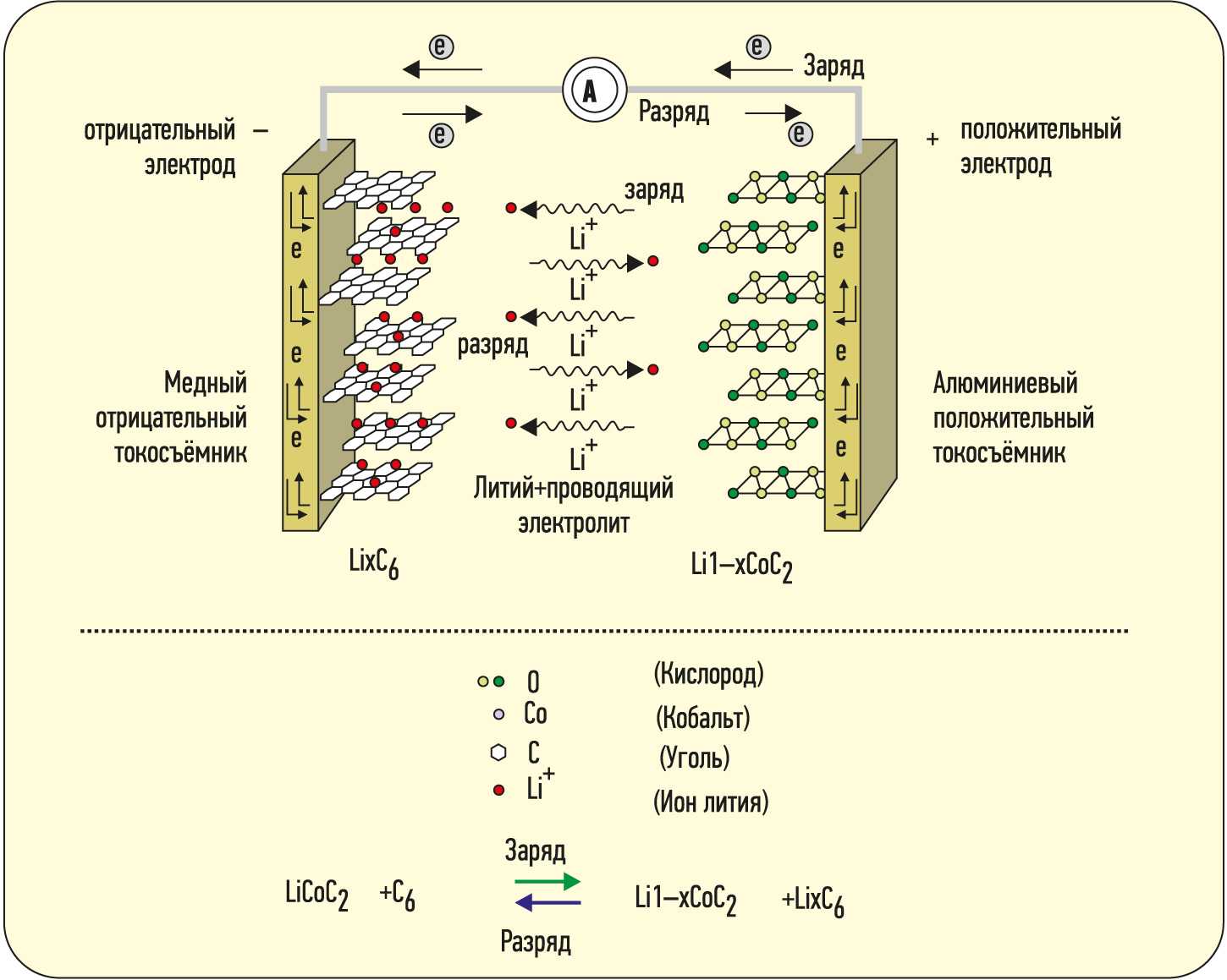 Все вышеуказанные Li-Ion-батареи работают по одному принципу. Во время разряда к катоду (положительный электрод, оксид металла) движутся ионы через электролит и сепаратор от анода (отрицательный электрод, пористый углерод). В процессе заряда движение происходит в обратном направлении. На рис. 1 отражена схема работы и устройства Li-Ion-батареи на примере LCO.