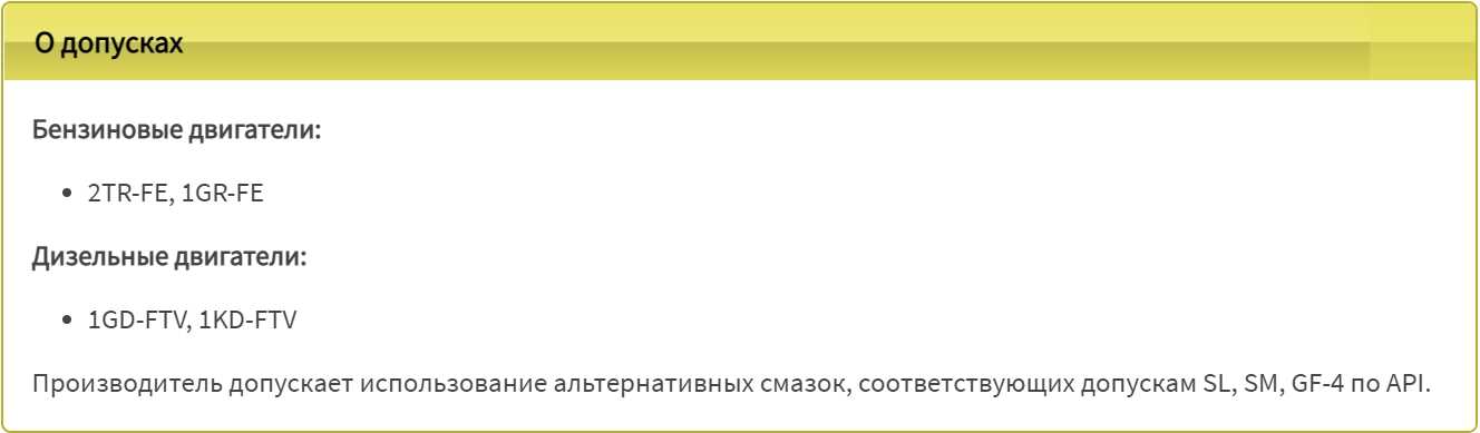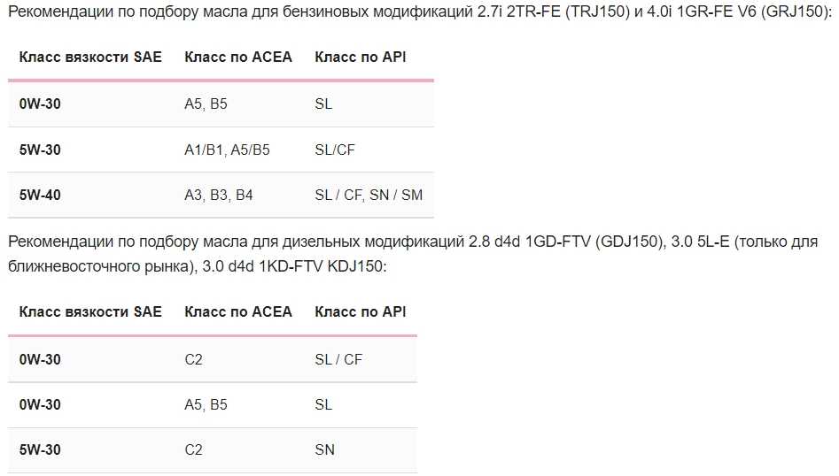 Параметры рекомендуемого моторного масла для Toyota Prado: