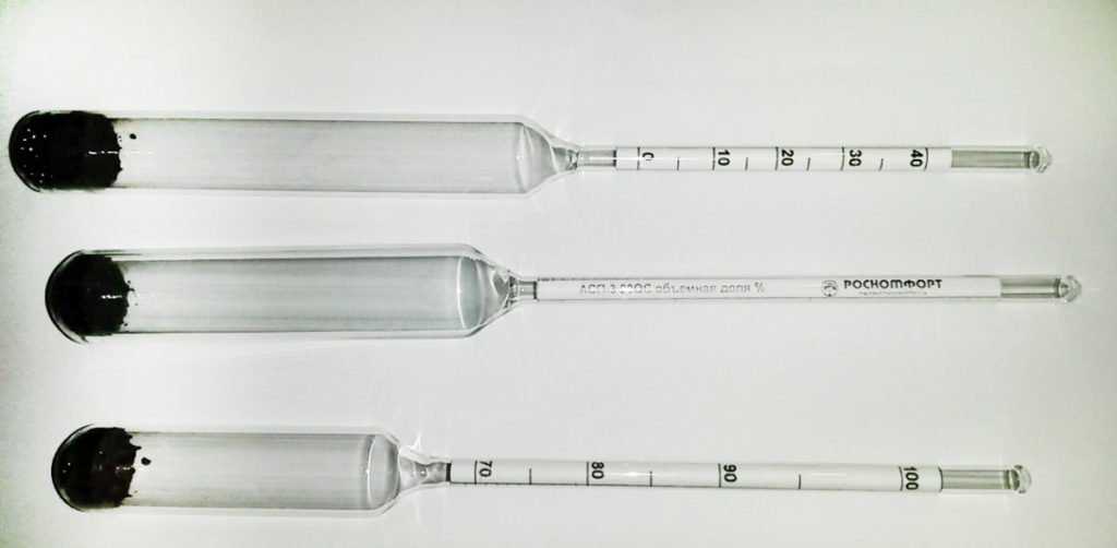 Например, для замера водки, ликера и других крепких напитков используются ареометры, градуировка которых находится в пределах 40 градусов. В случае с вином и другой слабоалкоголкой используются более точные колбы.