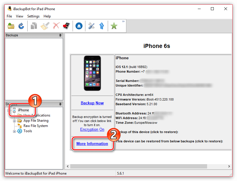 - Подключите Айфон к компьютеру с помощью USB-кабеля, а затем запустите iBackupBot. В левой части окна отобразится меню смартфона, в котором следует выбрать пункт «iPhone». В правой появится окно с информацией о телефоне. Чтобы получить данные о состоянии аккумулятора, кликните по кнопке «More Information».