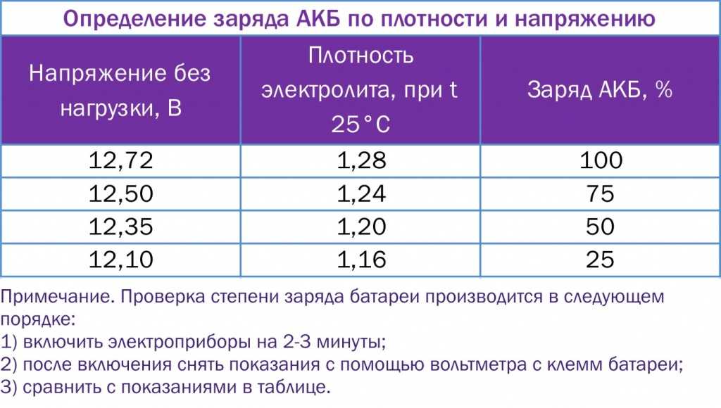 Есть еще один вариант — мультиметр. С его помощью можно измерить напряжение на клеммах. На полностью заряженной АКБ должно быть 12,6 В и более. Напряжение 12,42 В соответствует 80 % заряда, 12,2 В — 60 %, 11,9 В — 40 %, 11,58 В — 20 %, 10,5 В — 0 %.