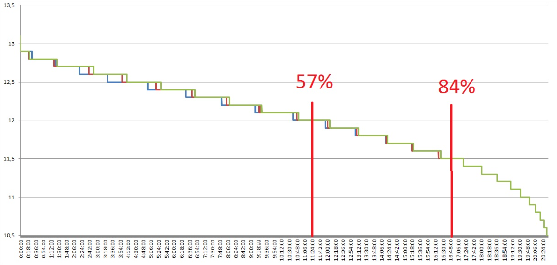 Разрядная кривая свинцово-кислотной АКБ – к концу цикла скорость падения напряжения увеличивается