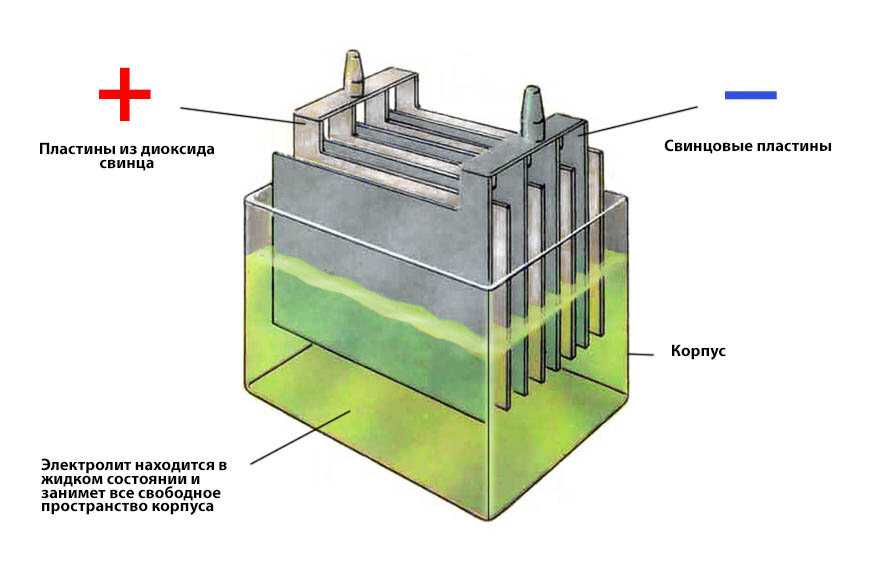 Чтобы понять, для чего нужен электролит, требуется знать, как вообще работает автомобильная АКБ. Внутри пластикового корпуса аккумулятора находятся 6 банок. В каждой из банок расположены по 2 пластины разной полярности: