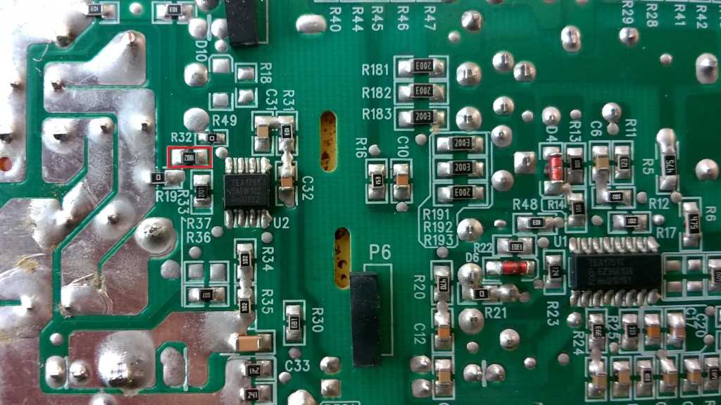 Для снижения напряжение на выходе ищем резистор, который соединяет шестую ножку TEA1761 и плюс с выхода блока питания (на фото отмечен красным).