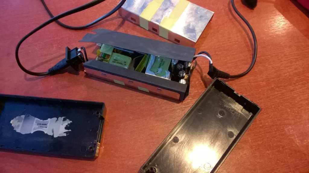 Собираем блок питания и подключаем крокодилы на конце шнура. (Необходимо тщательно проверять полярность на выходе шнура, в некоторых блоках питания «-» — это центральный провод, а «+» — оплетка).