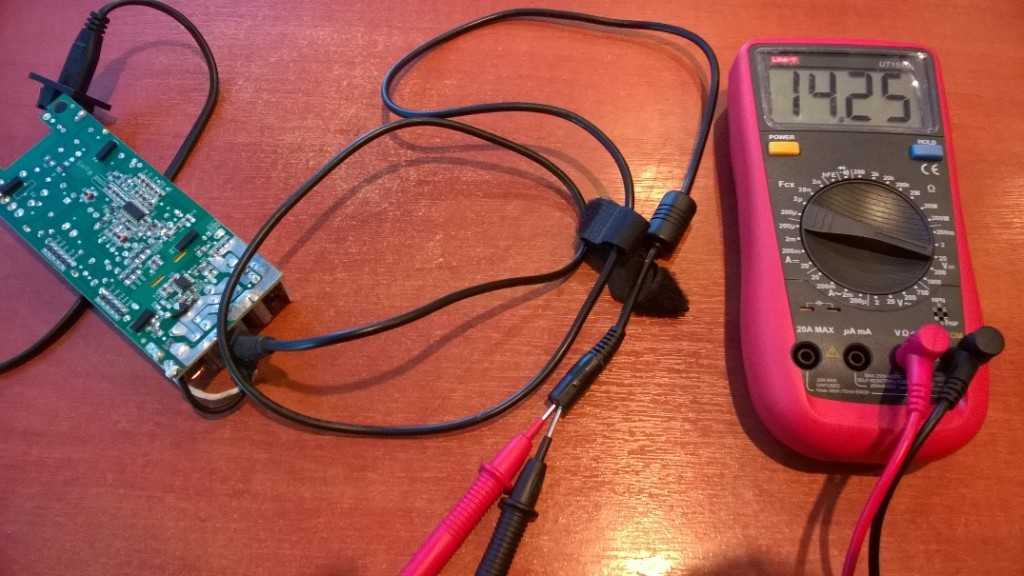 Тестируем работу блока – 14,25 В на выходе. Напряжение для зарядки автомобильного АКБ в самый раз.
