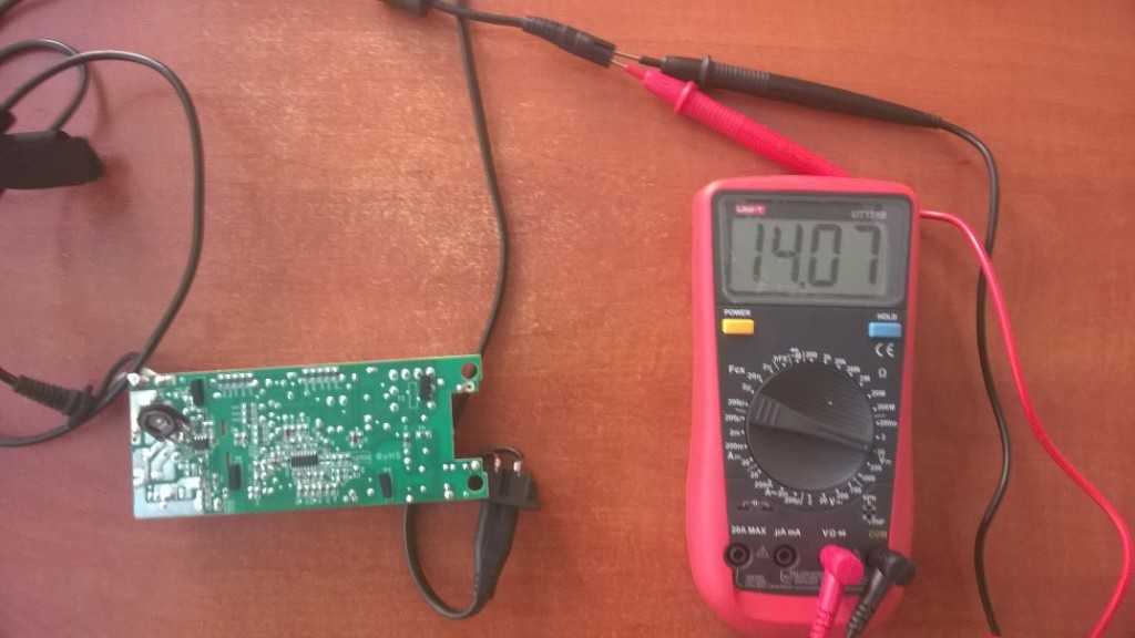 Постепенно снижая сопротивление добиваемся показания 14 — 14,5 В на выходе блока питания.