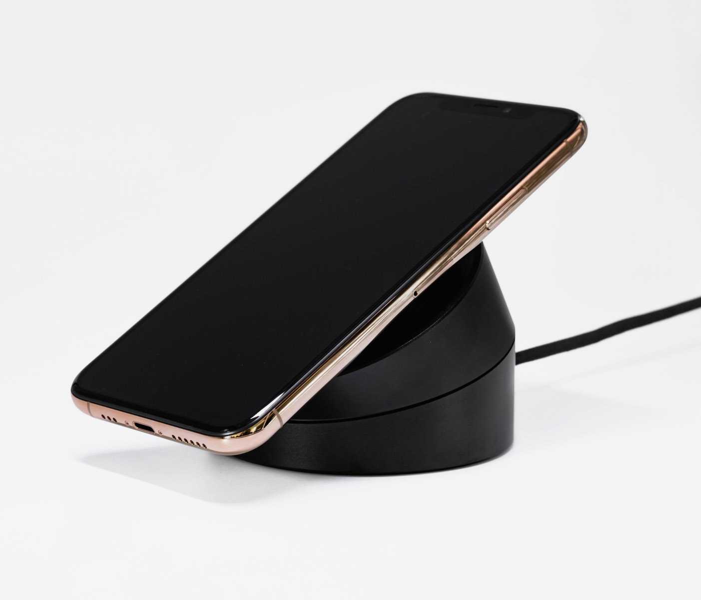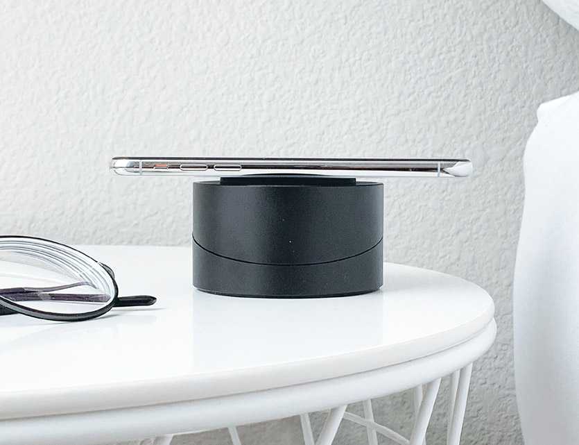 Небольшой круглый аксессуар для беспроводной зарядки можно использовать в двух положениях: смартфон лежит горизонтально, или под углом в 20 градусов.