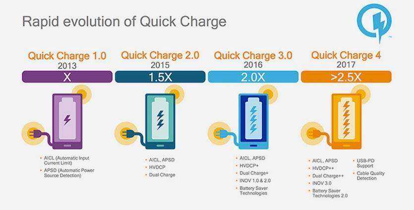 С 2016 года все смартфоны, поддерживающие эту Quick Charge, имеют стандарты 4 поколения. Qualcomm Quick Charge этой версии есть стандартная и расширенная. Последную помечают знаком “+”.