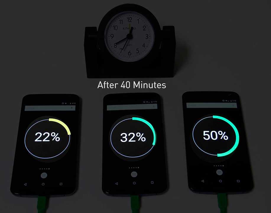 При стандартном режиме зарядки сила тока остаётся неизменной в ходе всего процесса. Можно сэкономить время, быстро «затолкав» мощным током первые 50-60% батареи, а затем снизить мощность до обычного уровня. На этом основана технология Quick Charge.