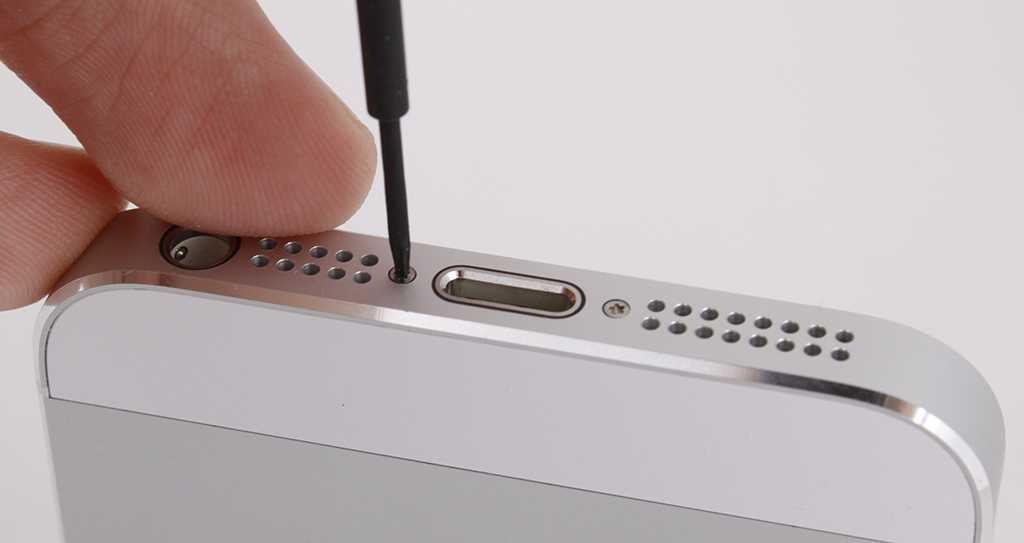 Теперь найдите в нижней части корпуса два болта (по обеим сторонам от Lightning-разъёма) и выкрутите их с помощью отвертки Philips Pentolobe, как показано на рисунке ниже.