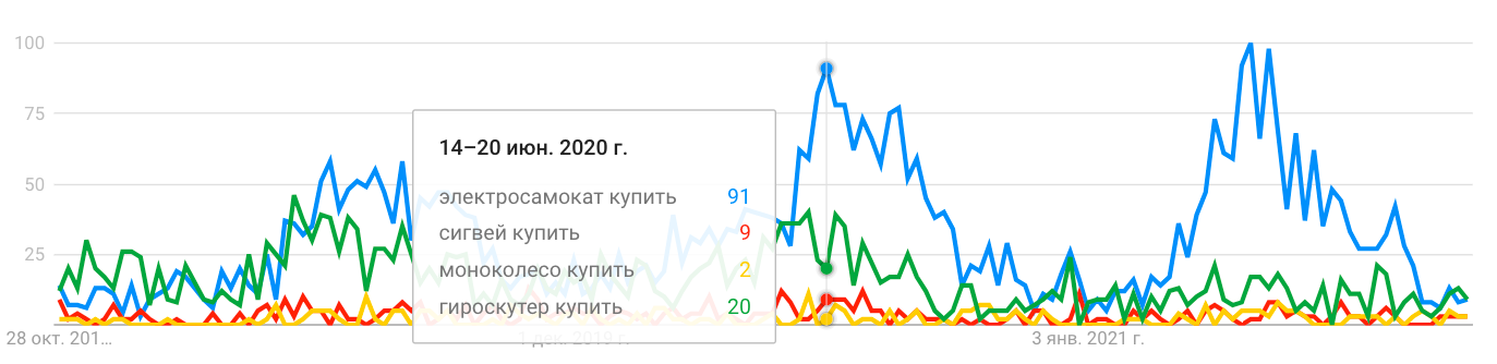 Моноколеса и сигвеи в равной степени популярны среди российского потребителя. Однако, они значительно уступают гироскутерам и электросамокатам по количеству поисковых запросов. Данную статистику можно изучить в сервисе Google Trends.