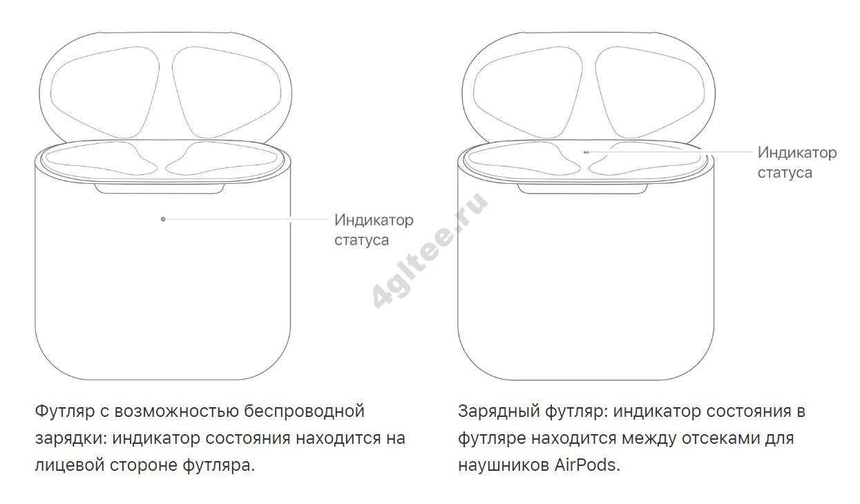 - Если наушники лежат в чехле, индикатор на передней стенке корпуса (вторая модель) или во внутренней части (первая модель) показывает состояние зарядки Эирподс;
