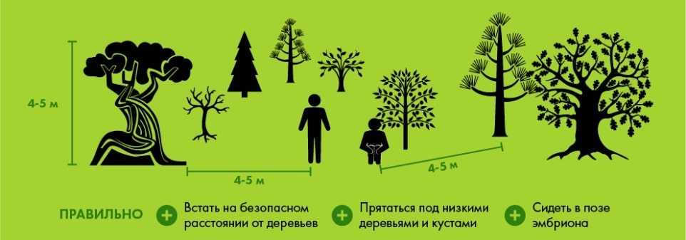 В лесной местности безопаснее всего найти укрытие под мелкими кустарниками. Если вблизи нет мелких кустов, то между деревьями и вами должно быть расстояние не менее 4-5 м. Нужно сесть, приняв позу эмбриона.