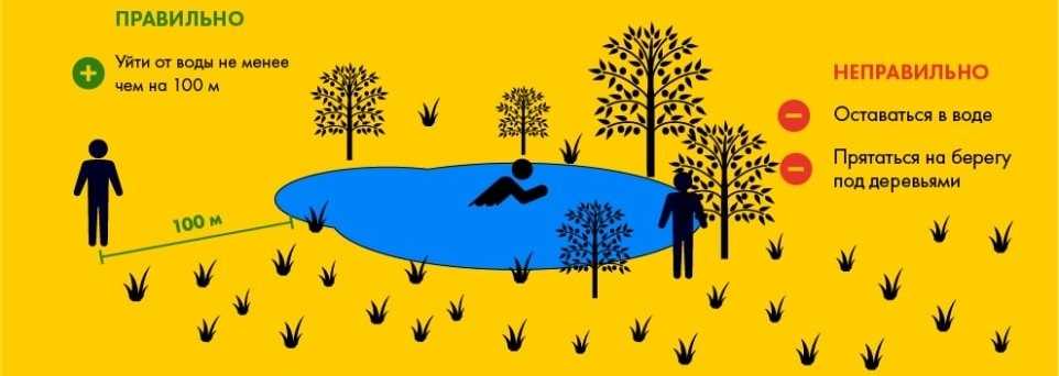 Вода является отличным проводником электричества, поэтому при грозе следует немедленно выйти из водоема и отойти от него на безопасное расстояние (минимум 100 м). Не стоит пережидать ее на берегу в палатке или прячась под деревьями, т.к. на берегу это самые возвышенные объекты.