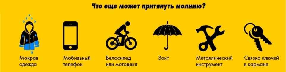 Помимо воды и мокрой одежды, молнию способны привлечь следующие вещи: работающий мобильный телефон, зонт (особенно спицы и стержень), любые вещи из металла (ключи, инструменты).