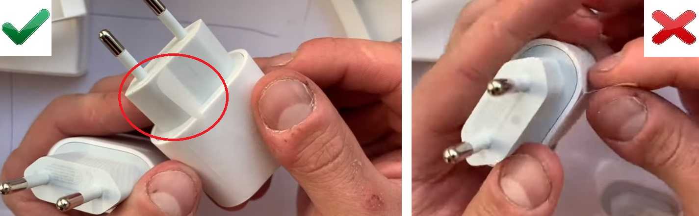 Часть зарядки с серым цветом должна быть матовой и НЕ блестеть на свету. В подделке(сверху) видно отражение света от угловой части.