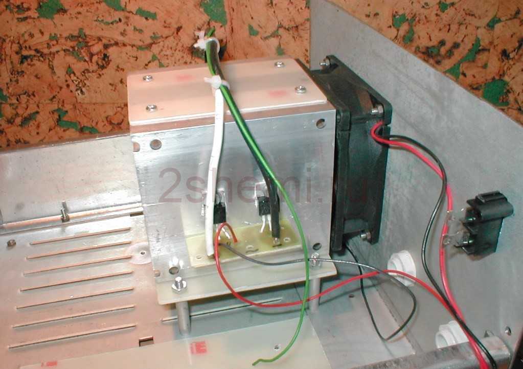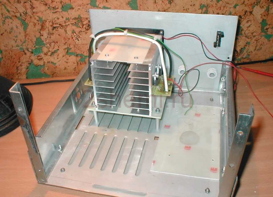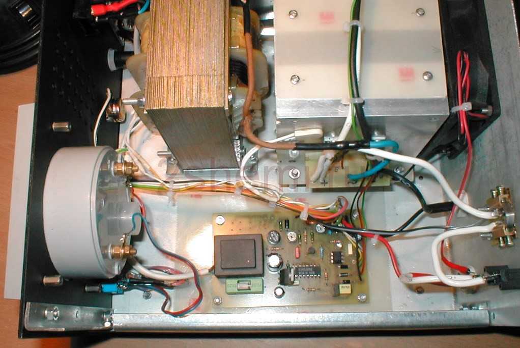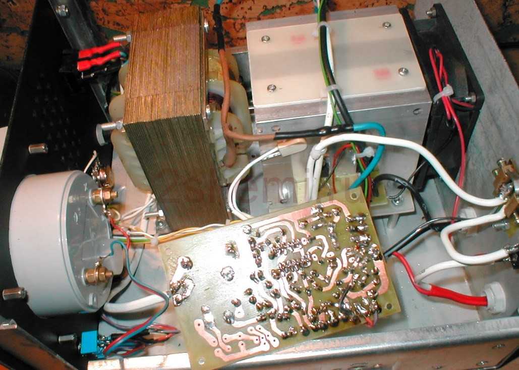Диодно-тиристорный мост размещен на отдельных платах и может проводить ток до 20 А, радиаторы изолированы друг от друга и корпуса. Вторичная обмотка трансформатора намотана проволокой диаметром около 2 мм, и при принудительном охлаждении она может дать долговременно около 8 А (достаточно для большинства нужд автолюбителей, заряжая батареи до 82 А/ч). Но ничего не мешает установить трансформатор с ещё большей мощностью.
