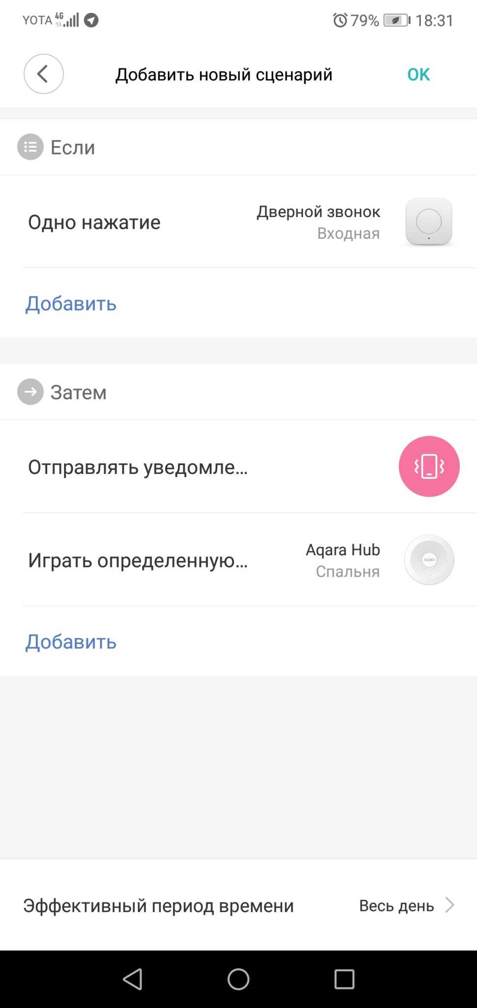 Во время заказа устройства, рассчитывал, что в сценариях будет доступно однократное, двойное и долгое нажатие. По факту, получил кнопку, в которой отсутствует длительное нажатие. Не знаю почему так, читал комментарии и как оказалось я не один такой, написал продавцу, посмотрим, что ответит В начале статьи я писал, что кнопка покупалась для дверного звонка, расскажу как это дело настраивается. Нажимаем на «Добавить сценарии», по умолчанию идет «Одно нажатие», в поле «Затем» выбираем шлюз из перечня умных устройств, далее «Play designated ringstone», настраиваем громкость и выбираем мелодию. В самом низу находится настройка «Эффективный период времени» в этом разделе настраивается день и время (период времени, когда сценарий будет активен). Дополнительно, к звонку, я настроил отправку уведомлений на мобильный телефон, теперь буду в курсе всех дверных звонков :). Не забудьте нажать кнопку «ОК», чтобы сохранить новый сценарий.