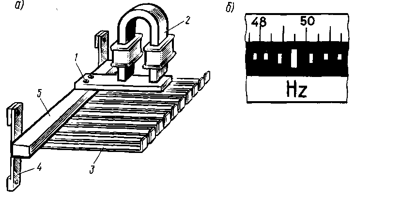 Электромагнитный резонансный частотомер имеет электромагнит 2 (рис. 344, а), в поле которого расположены стальной якорь 1 и соединенный с ним стальной брусок 5. Этот брусок укреплен на упругих пружинах 4 и на нем размещен ряд гибких стальных пластинок 3, площадь поперечного сечения которых подобрана таким образом, что каждая следующая пластинка имеет частоту собственных колебаний на 0,5 Гц больше, чем предыдущая. Сво-