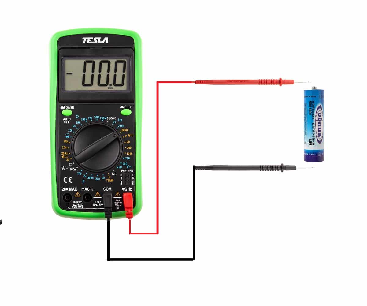 Наиболее простым примером измерения напряжения в бытовых условиях является пальчиковая батарейка. В ней вам необходимо приложить черный щуп к выводу «– », а красный к выводу « + », позицию переключателя установить на 2 В постоянного напряжения.