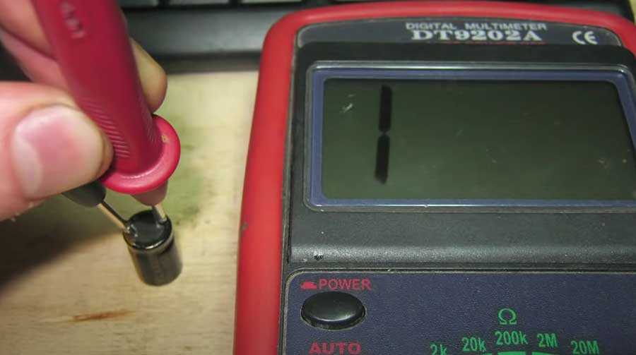 Конденсатор начинает заряжаться при подключении щупов. Сопротивление растет до максимума. Если при щупов мультиметр запищит при нулевом значении, значит произошло короткое замыкание. Если сразу на циферблате высвечивается значение 1, то в элементе внутренний обрыв. Такие кондеры считаются неисправными — замыкание и обрыв внутри элемента неустранимы.