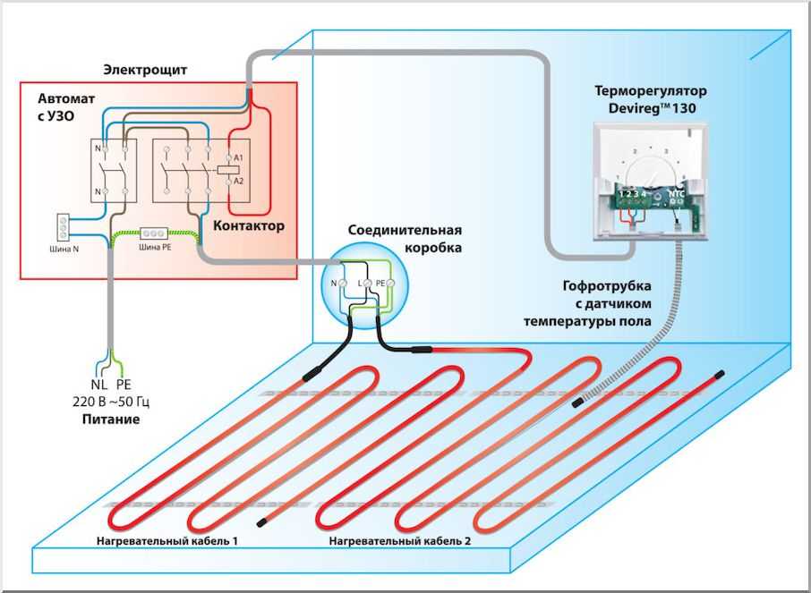 Схема монтажа электрических теплых полов может меняться при увеличении количества контуров, а также в зависимости от вида подключения (двух и трехфазное)
